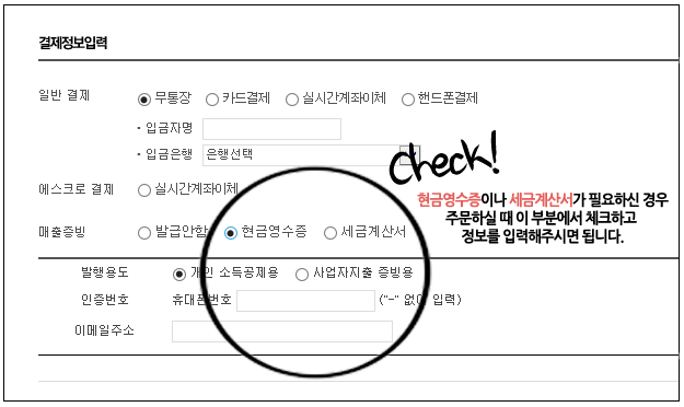 ★ 간혹 주문하실 때 결제창에서 현금영수증이나 세금계산서등 증빙자료 발급을 누락하시는 회원님들이 계십니다.