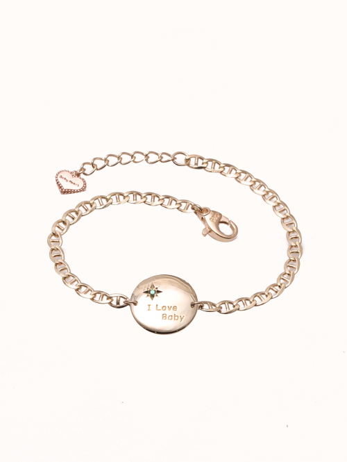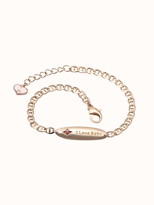 동글동글한 마우스 디자인에 써클 참 속 하트가 귀여움을 더해드리는 베이비 팔찌입니다.
