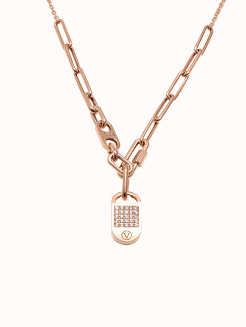 • 자물쇠 느낌의 쉐입이 메인 장식으로 볼드하고 세련된 디자인의 사슬 체인이 연결된 페미닌하면서 세련된 무드의 목걸이