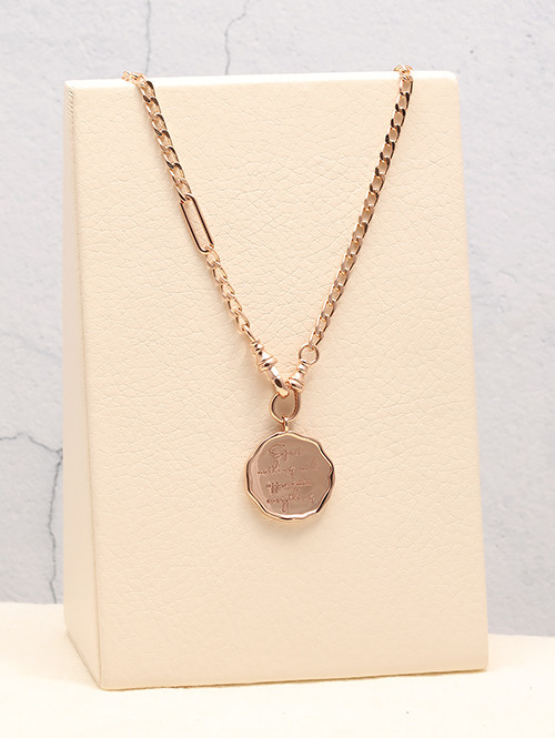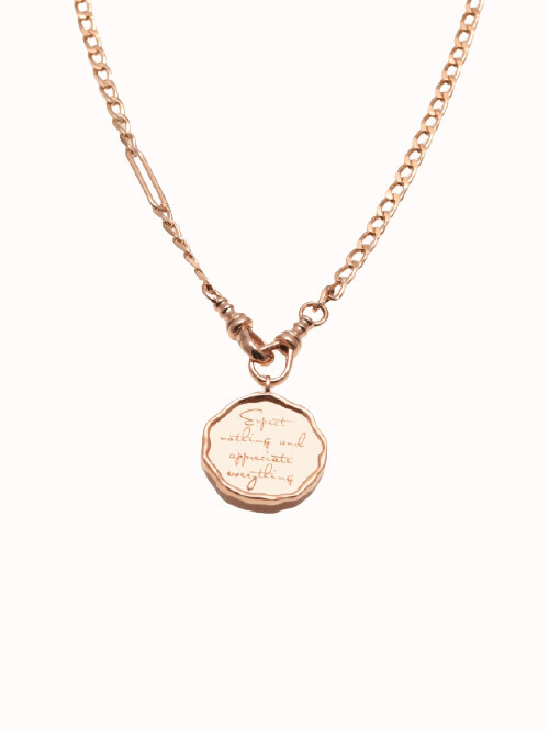 • "아무것도 기대하지 말고 모든 것에 감사하라." 라는 의미가 담긴 레터링을 찍어낸듯한 씰 디자인을 모티브로 제작된 목걸이