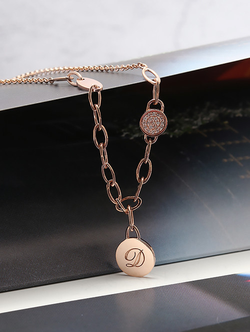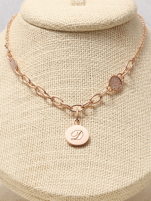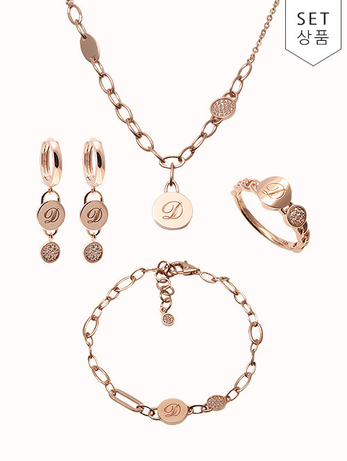 • 알파벳 D가 각인된 써클 팬던트를 메인 장식으로 체인이 언발한 디자인으로 제작된 목걸이