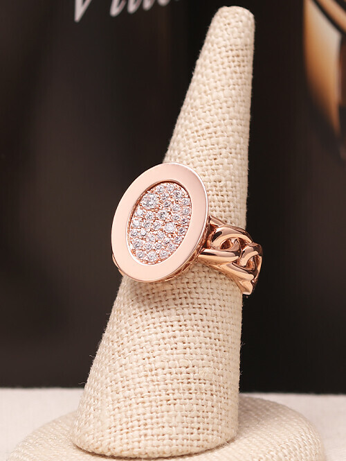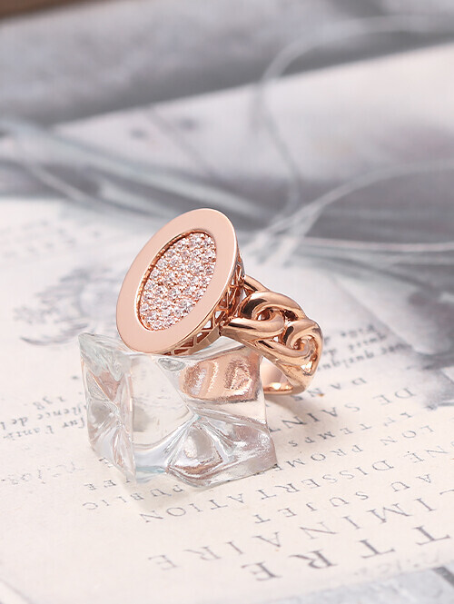 • 존재감있는 빅사이즈 써클 쉐입에 글로시한 큐빅이 가득 세팅된 드레시한 무드의 반지