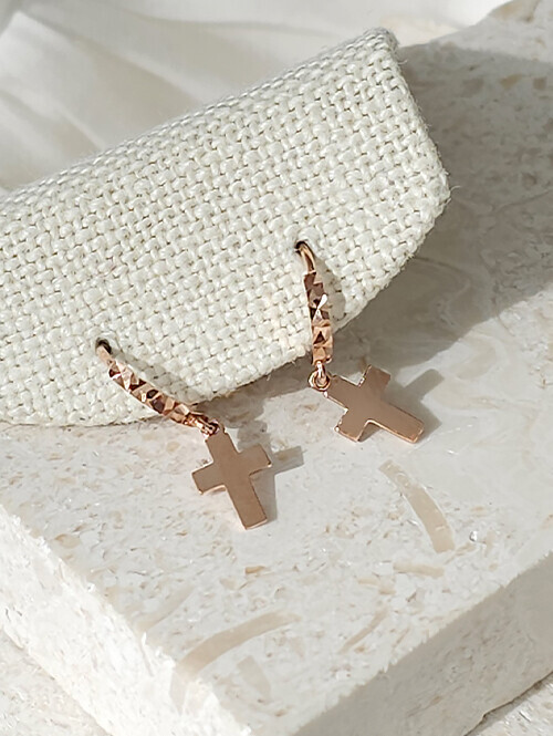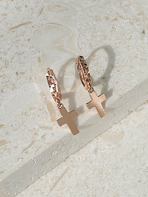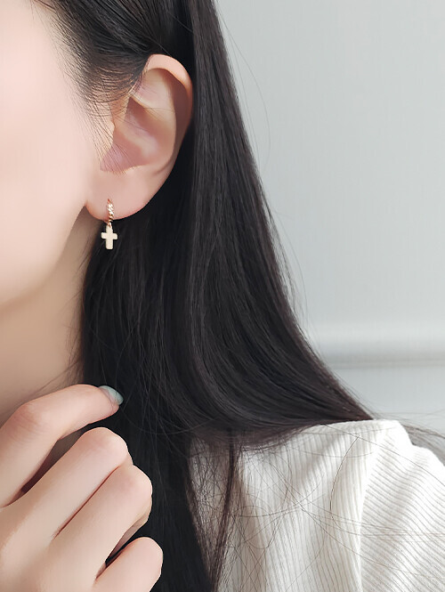• 글로시한 컷팅 원터치 링과 미니십자가가 매치된 화사한 무드의 귀걸이